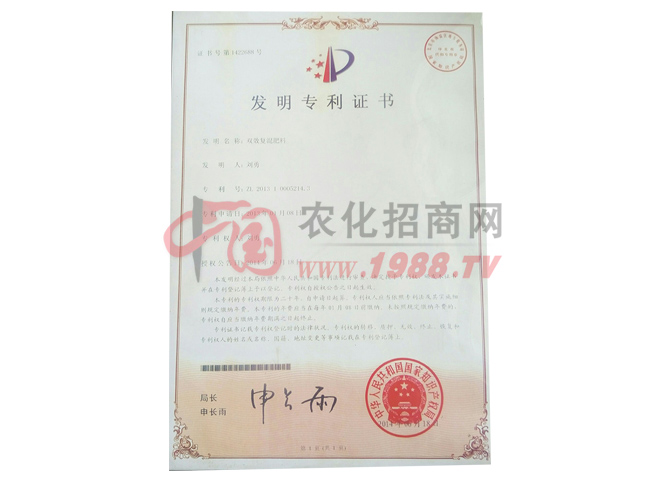本公司科研人員歷經(jīng)五年研制的“雙效復(fù)合肥”已申請(qǐng)國(guó)家專利,申請(qǐng)?zhí)枮椋?00810079499.4!半p效復(fù)合肥”中配制有土壤殺菌劑,對(duì)玉米粗縮病、小麥全蝕病、赤霞病、白粉病、花生落葉病、棉花枯黃萎病及各種農(nóng)作物的死菌爛根有較好防治作用,真是號(hào)稱:“一肥雙效,能治病的好肥料”。