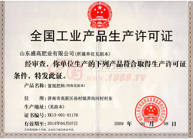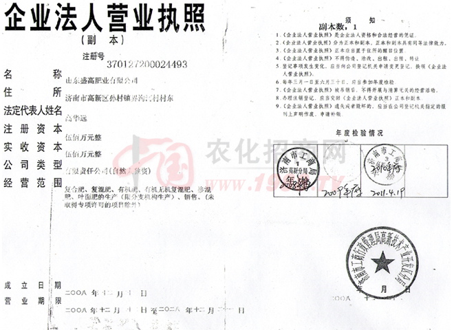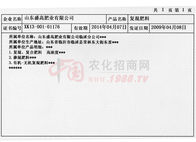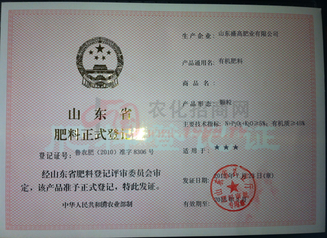 證書名稱:肥料正式登記證 發(fā)證機構:山東省農(nóng)業(yè)廳